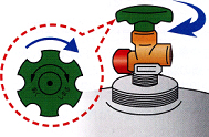 容器バルブを閉めるときは右回し(時計回り)です。